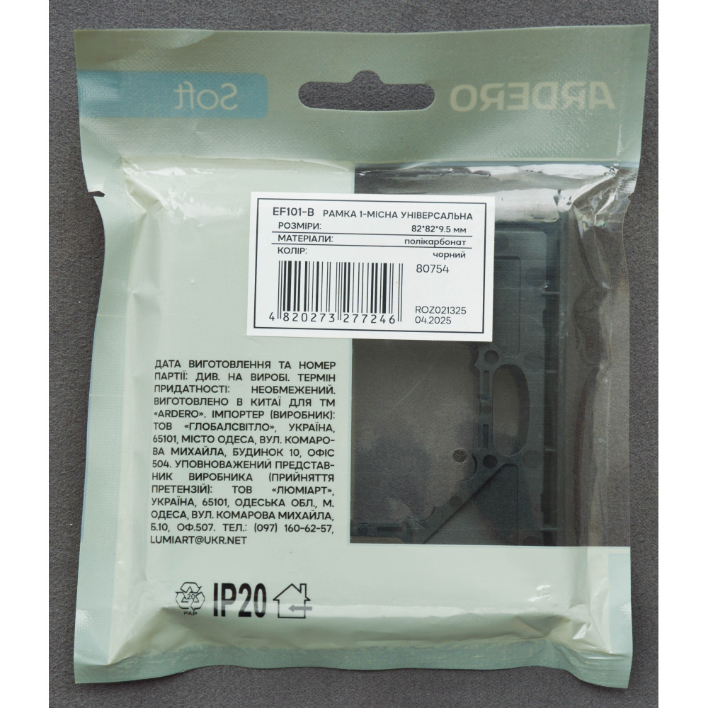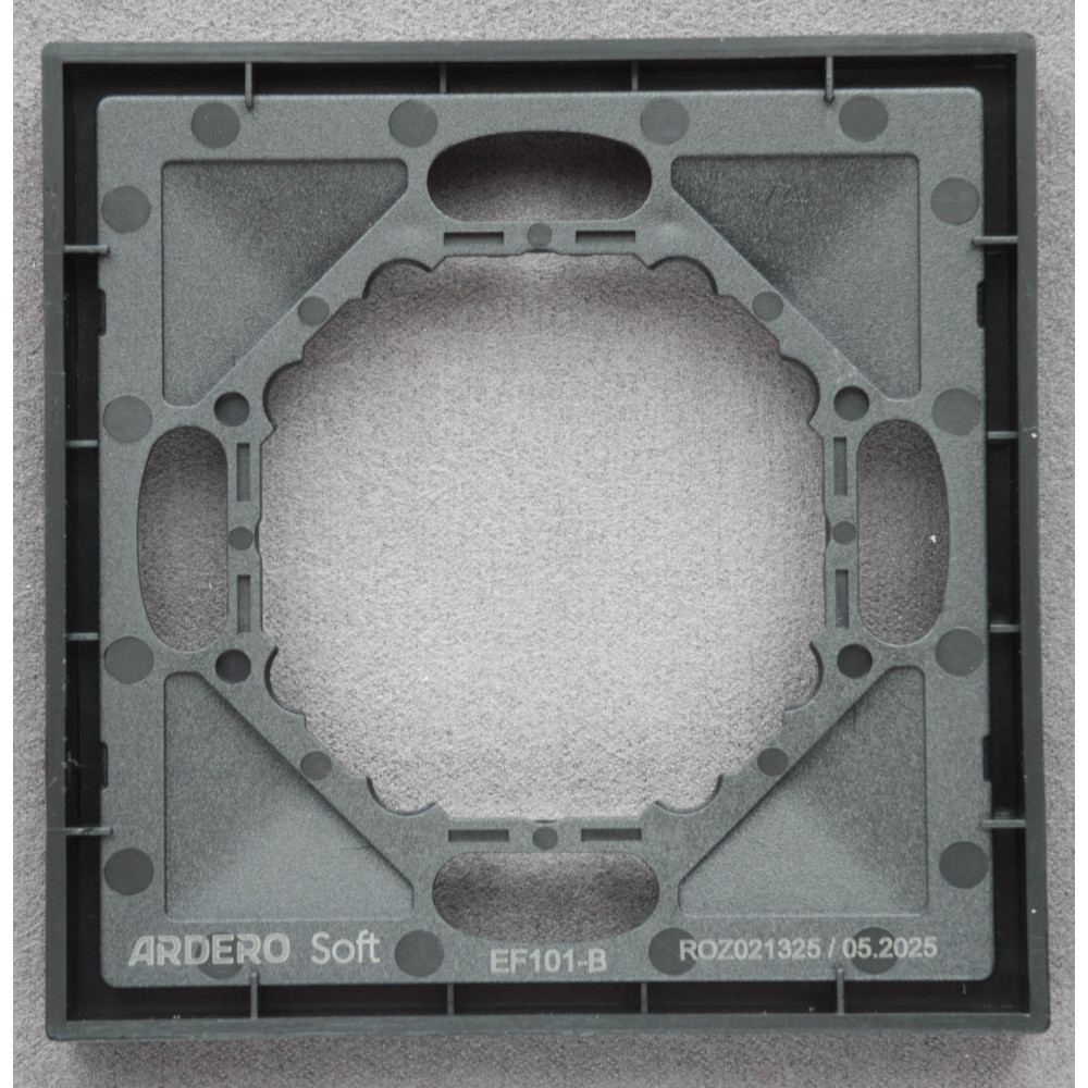 Ardero EF101-B рамка 1-местная универсальная, черный Soft – стильное и практичное решение для оформления розеток и выключателей. Изготовлена из высококачественного поликарбоната с приятным на ощупь матовым покрытием Soft-touch, что обеспечивает современный вид и дополнительную стойкость к царапинам. Универсальная конструкция позволяет использовать рамку с разными механизмами серии Ardero, обеспечивая надежную фиксацию и удобство монтажа. Лаконичный чёрный цвет гармонично сочетается с любым интерьером – от классики до минимализма.