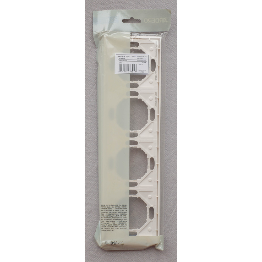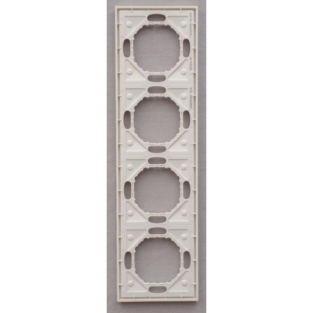 Ardero EF104-W рамка 4-местная универсальная, белый Soft – стильное и практичное решение для оформления розеток и выключателей. Изготовлена из высококачественного поликарбоната с приятным на ощупь матовым покрытием Soft-touch, что обеспечивает современный вид и дополнительную стойкость к царапинам. Универсальная конструкция позволяет использовать рамку с разными механизмами серии Ardero, обеспечивая надежную фиксацию и удобство монтажа. Лаконичный белый цвет гармонично сочетается с любым интерьером – от классики до минимализма.