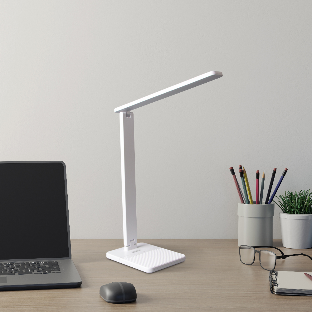 На основе светильника расположены держатель для телефона и кнопка управления уровнями яркости и температуры свечения – благодаря этому светильник можно использовать для обучения, работы и отдыха.