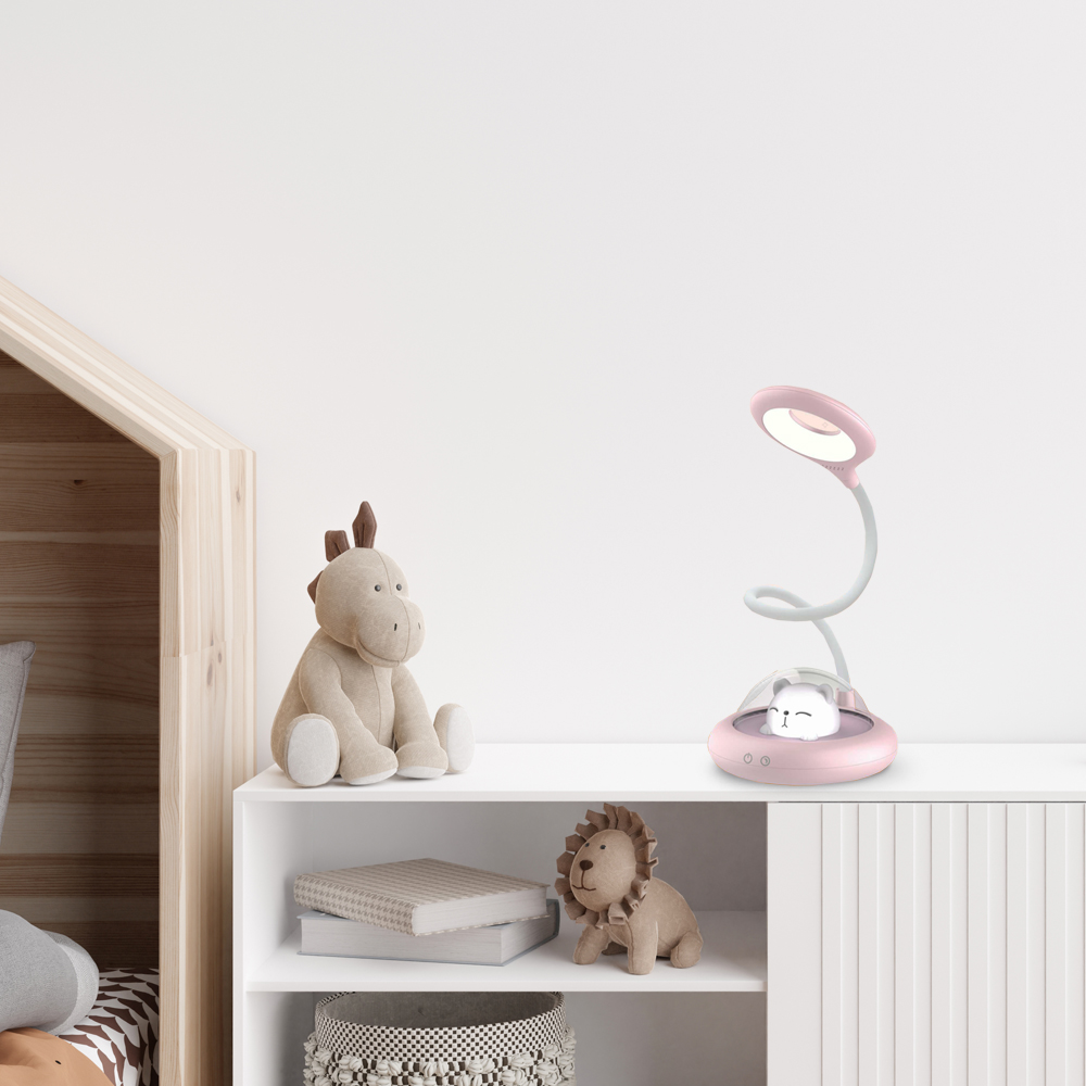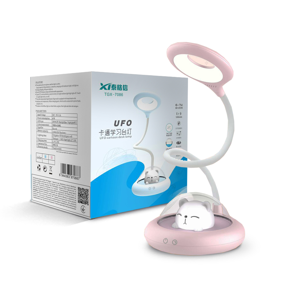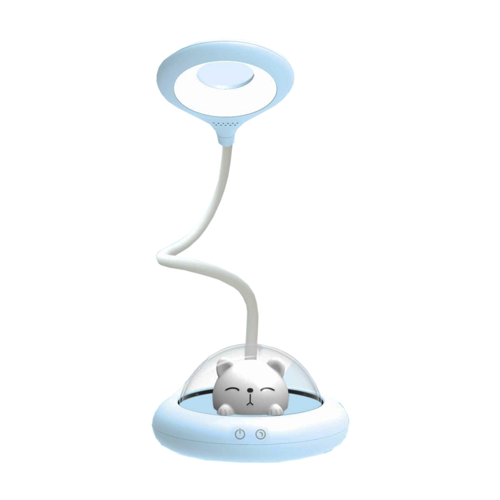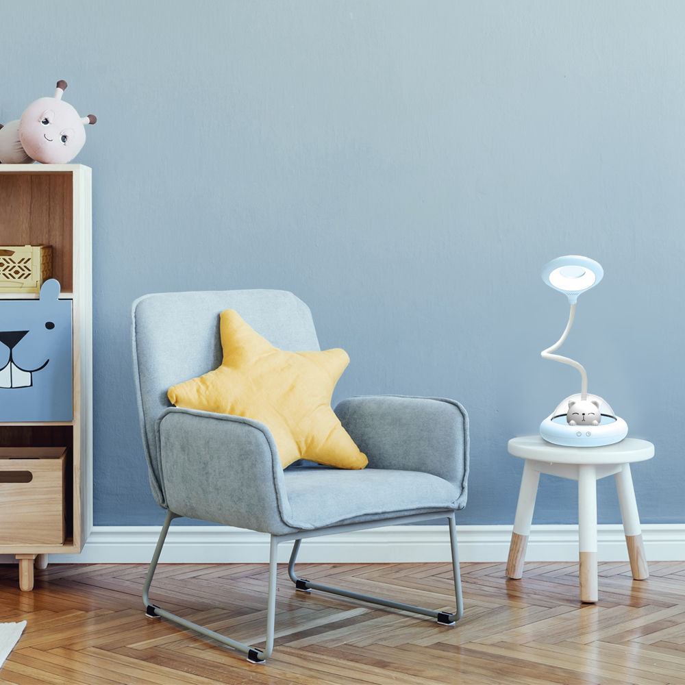 Настольный аккумуляторный светильник в пластиковом корпусе голубого и розового цвета. Светильник имеет три уровня яркости и режим ночника, которые переключаются благодаря сенсорной кнопке. Благодаря гибкой ножке светильник можно поворачивать на 360 градусов. Время работы составляет 6-7 часов при низкой яркости, 5-6 часов при средней яркости и 3-4 часа работы с высокой яркостью. Емкость батареи - 1200mAh, а время подзарядки составляет 2-3 часа. В комплекте к светильнику едет USB кабель длиной 1,2м.