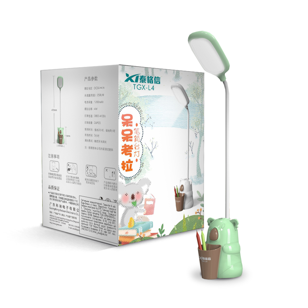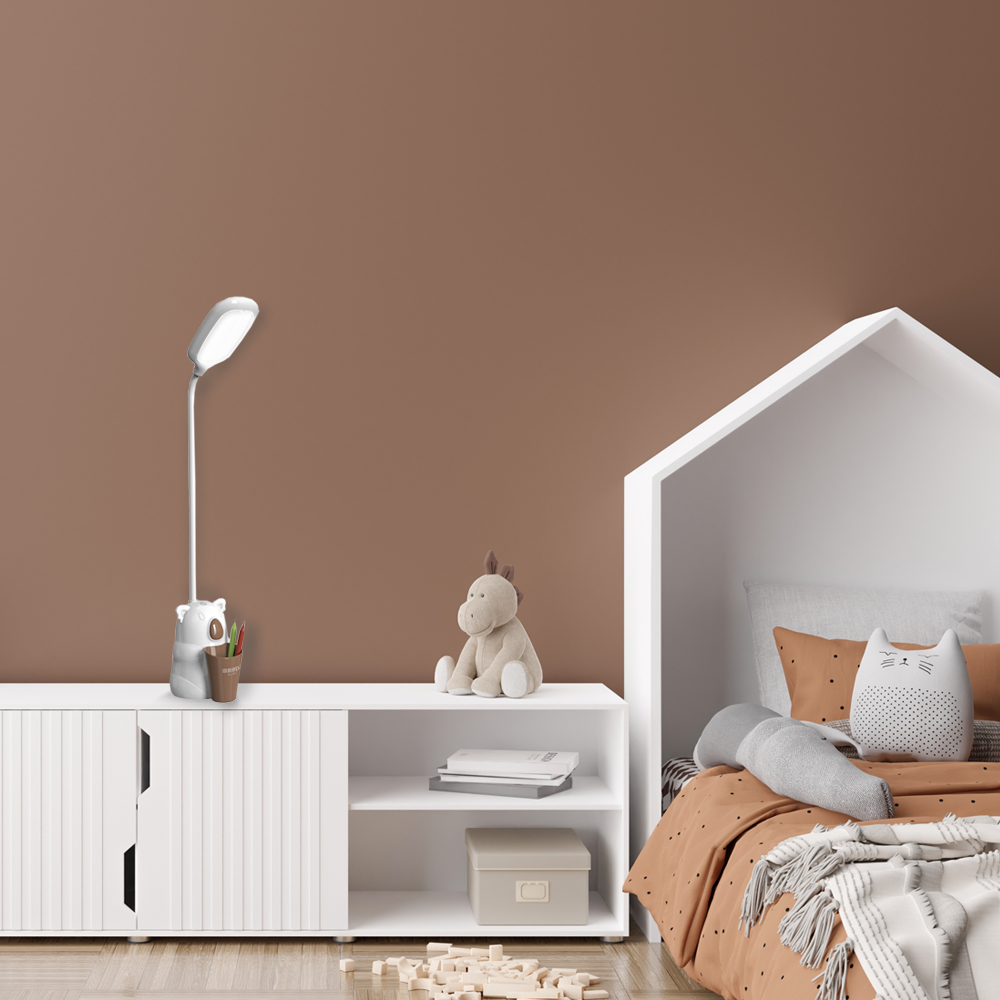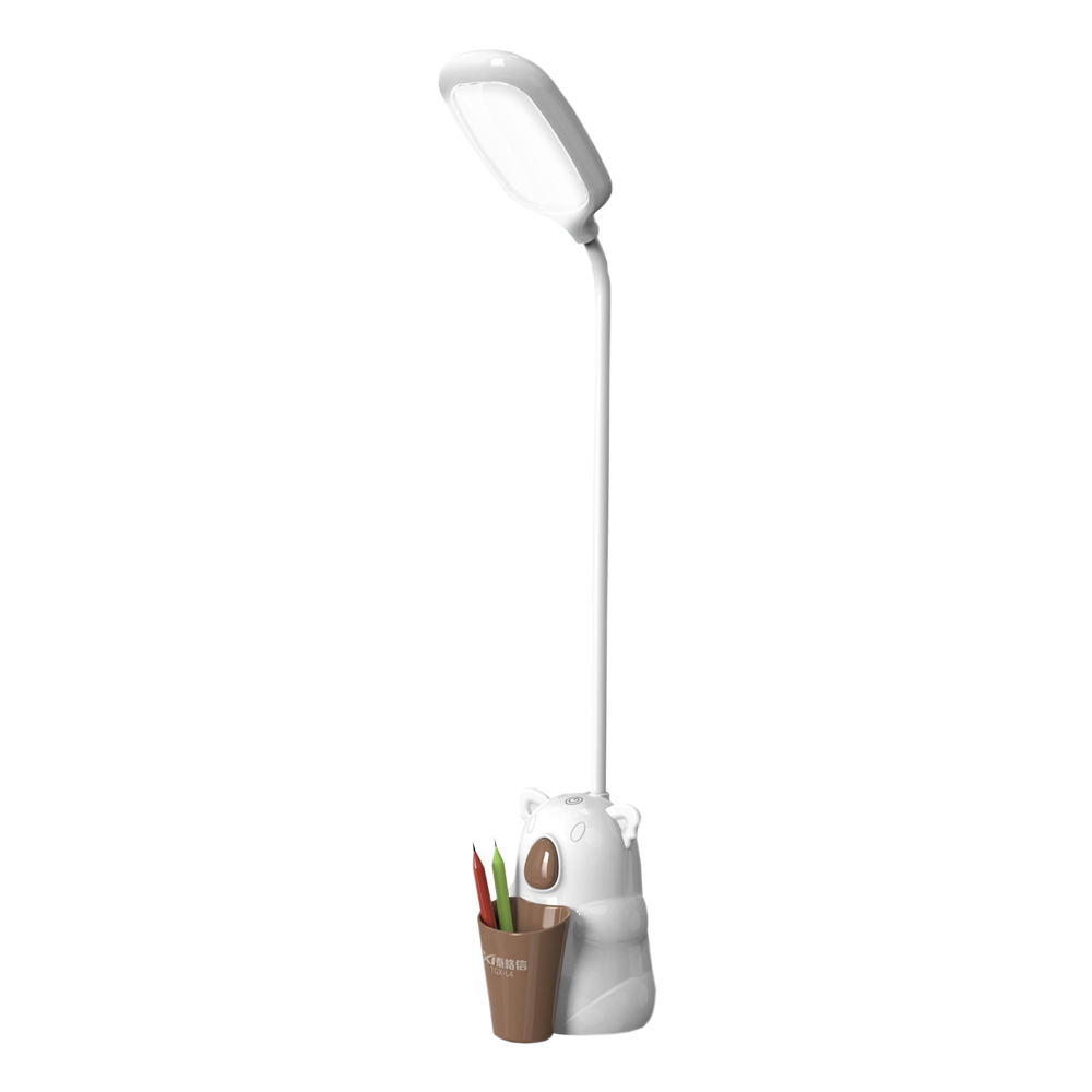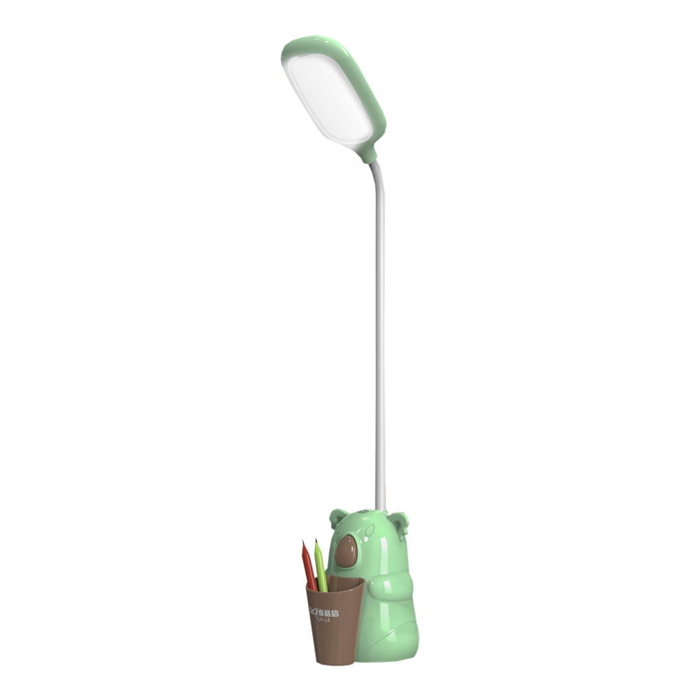 Настольный аккумуляторный светильник в пластиковом корпусе в розово-коричневом и зелено-оранжевом цветах. Благодаря гибкой ножке светильник можно поворачивать на 360 градусов, а встроенному держателю для ручек и карандашей держать порядок за столом. Светильник имеет три уровня яркости и переключается благодаря сенсорной кнопке. Время работы составляет 6-7 часов при низкой яркости, 2,5-3 часа при средней яркости и 2 часа работы с высокой яркостью. Емкость батареи - 1200mAh, а время подзарядки составляет 2-3 часа. В комплекте к светильнику идет USB кабель длиной 1,2м.