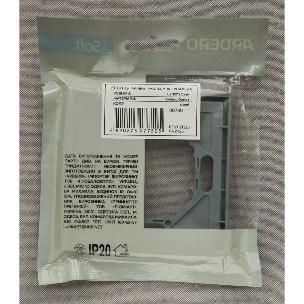 Ardero EF101-G рамка 1-місна універсальна, сірий Soft – стильне та практичне рішення для оформлення розеток і вимикачів. Виготовлена з високоякісного полікарбонату з приємним на дотик матовим покриттям Soft-touch, що забезпечує сучасний вигляд і додаткову стійкість до подряпин. Універсальна конструкція дозволяє використовувати рамку з різними механізмами серії Ardero, забезпечуючи надійну фіксацію та зручність монтажу. Лаконічний сірий колір гармонійно поєднується з будь-яким інтер’єром – від класики до мінімалізму.
