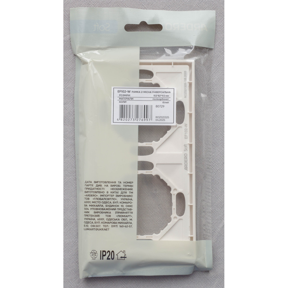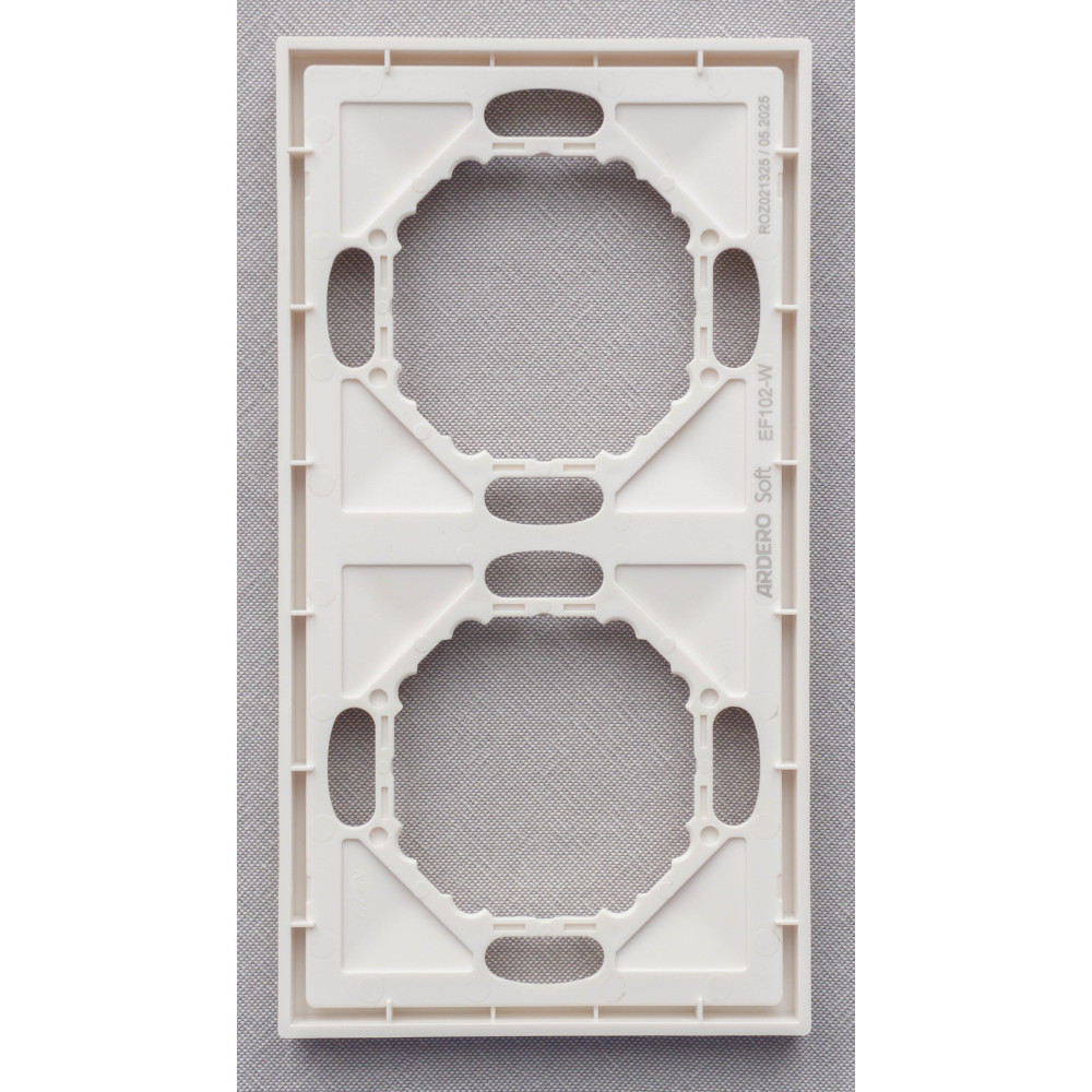 Ardero EF102-W рамка 2-місна універсальна, білий Soft – стильне та практичне рішення для оформлення розеток і вимикачів. Виготовлена з високоякісного полікарбонату з приємним на дотик матовим покриттям Soft-touch, що забезпечує сучасний вигляд і додаткову стійкість до подряпин. Універсальна конструкція дозволяє використовувати рамку з різними механізмами серії Ardero, забезпечуючи надійну фіксацію та зручність монтажу. Лаконічний білий колір гармонійно поєднується з будь-яким інтер’єром – від класики до мінімалізму.