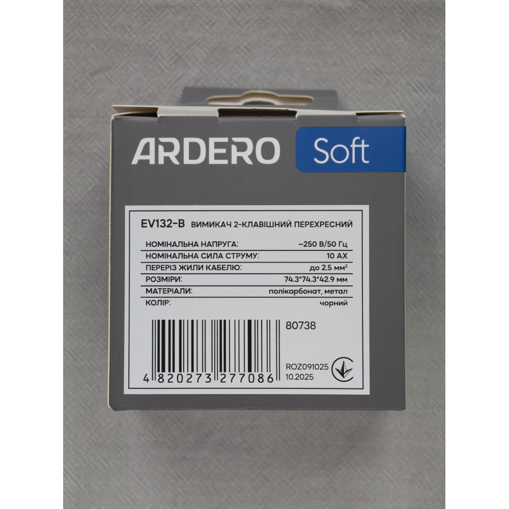 Перехресний вимикач Ardero Soft легко встановлюється, забезпечує надійне підключення та сумісний із рамками серії. Його стильний чорний механізм підкреслює сучасний інтер'єр та підходить для будь-яких дизайнерських рішень.